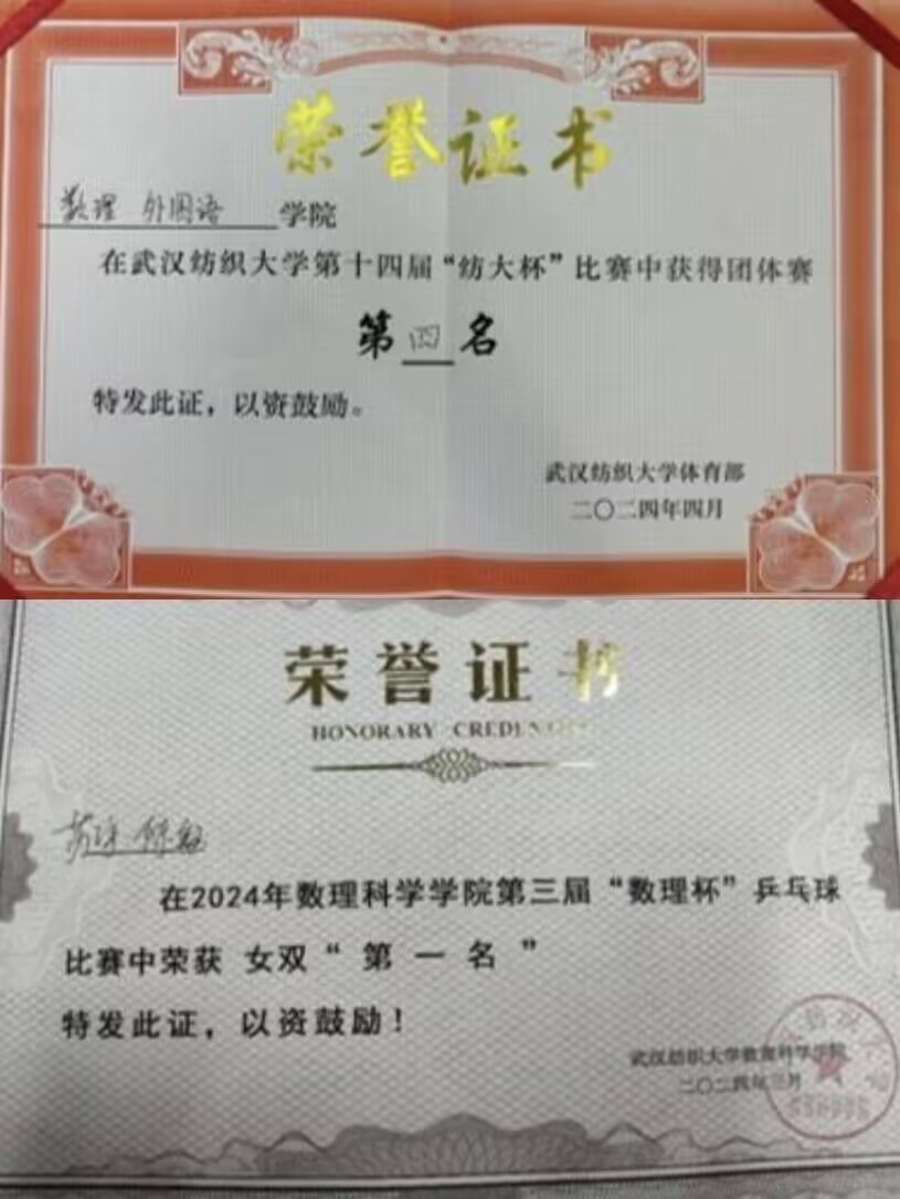 苏宇,女,汉族,共青团员,数学与统计学院应数12301班学生,现任应数12301班学习委员,曾任院体育部部长、院乒乓球副队长。曾获2023-2024学年一等学业奖学金,主持2024年大学生创新创业训练计划省级立项一项。获2023-2024学年三好学生,青年志愿者优秀个人等荣誉称号;在专业竞赛中屡创佳绩,获第十七届“华中杯”大学生数学建模挑战赛一等奖、第十一届全国大学生统计建模大赛二等奖;学习之余,积极进行体育运动,在武汉纺织大学第十四届“纺大杯”比赛中斩获团体赛第二名,用全面发展的实绩诠释了新时代青年的青春担当。