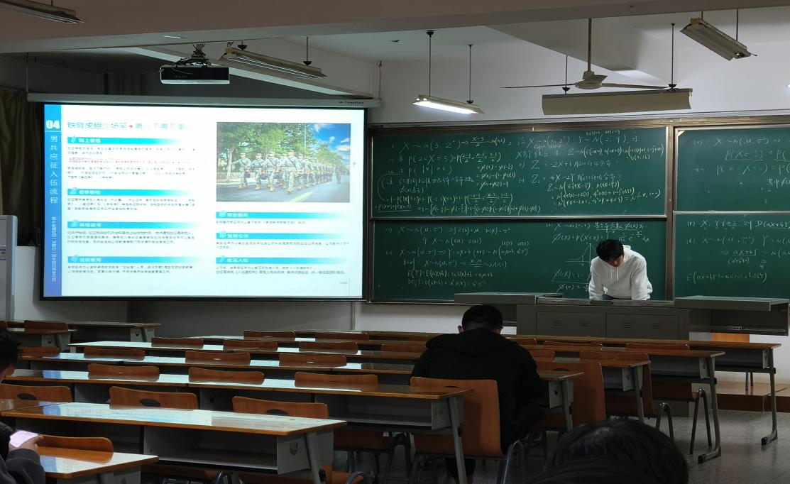 为让同学们对国防建设、参军入伍有更全面的认识和更深刻的感悟,数学与统计学院于2025年11月23日在崇志楼开展了以“携笔从戎立青春,热血报国正当时”为主题的班会,班会由各班班长主持,全体同学参加。