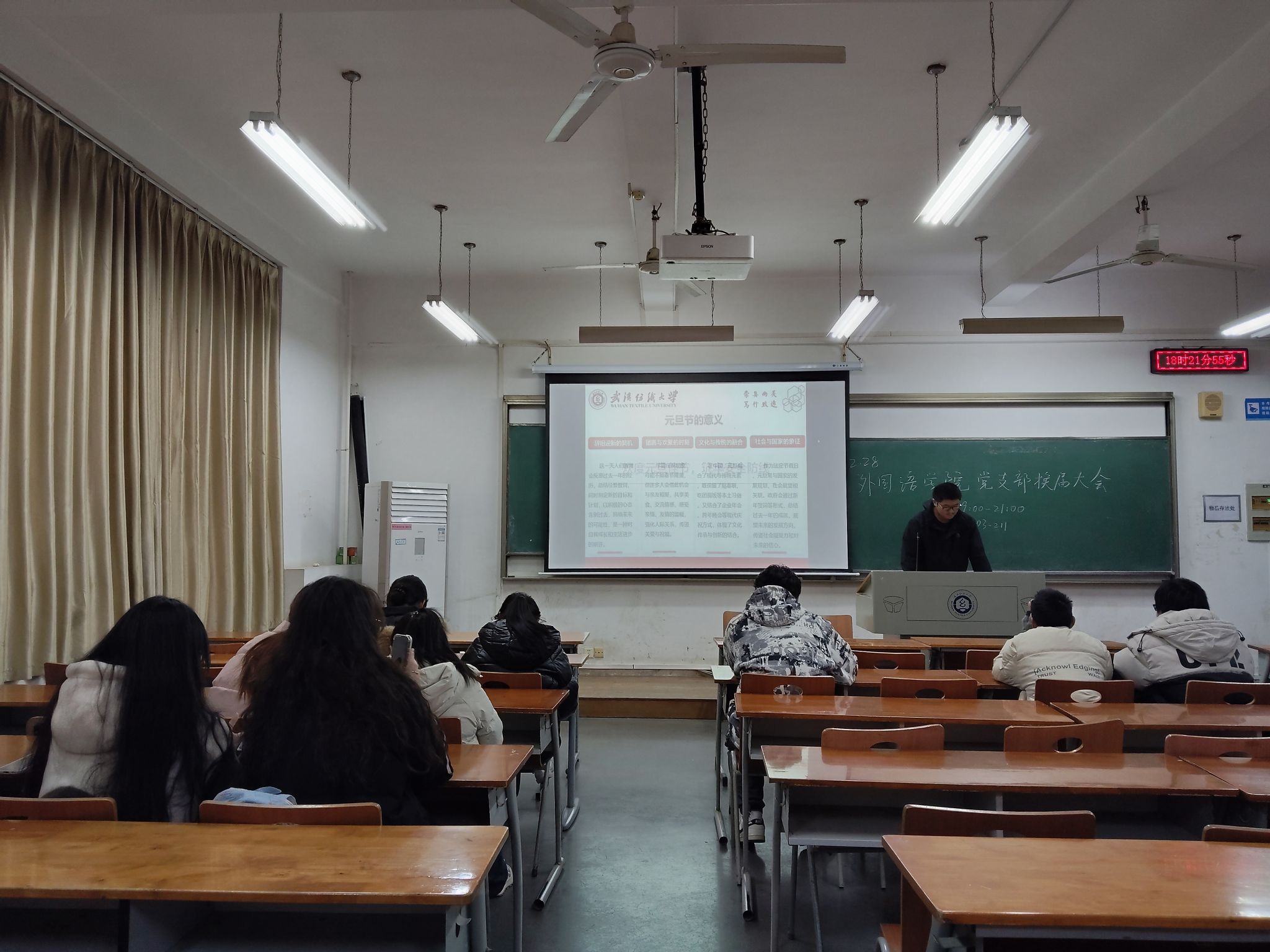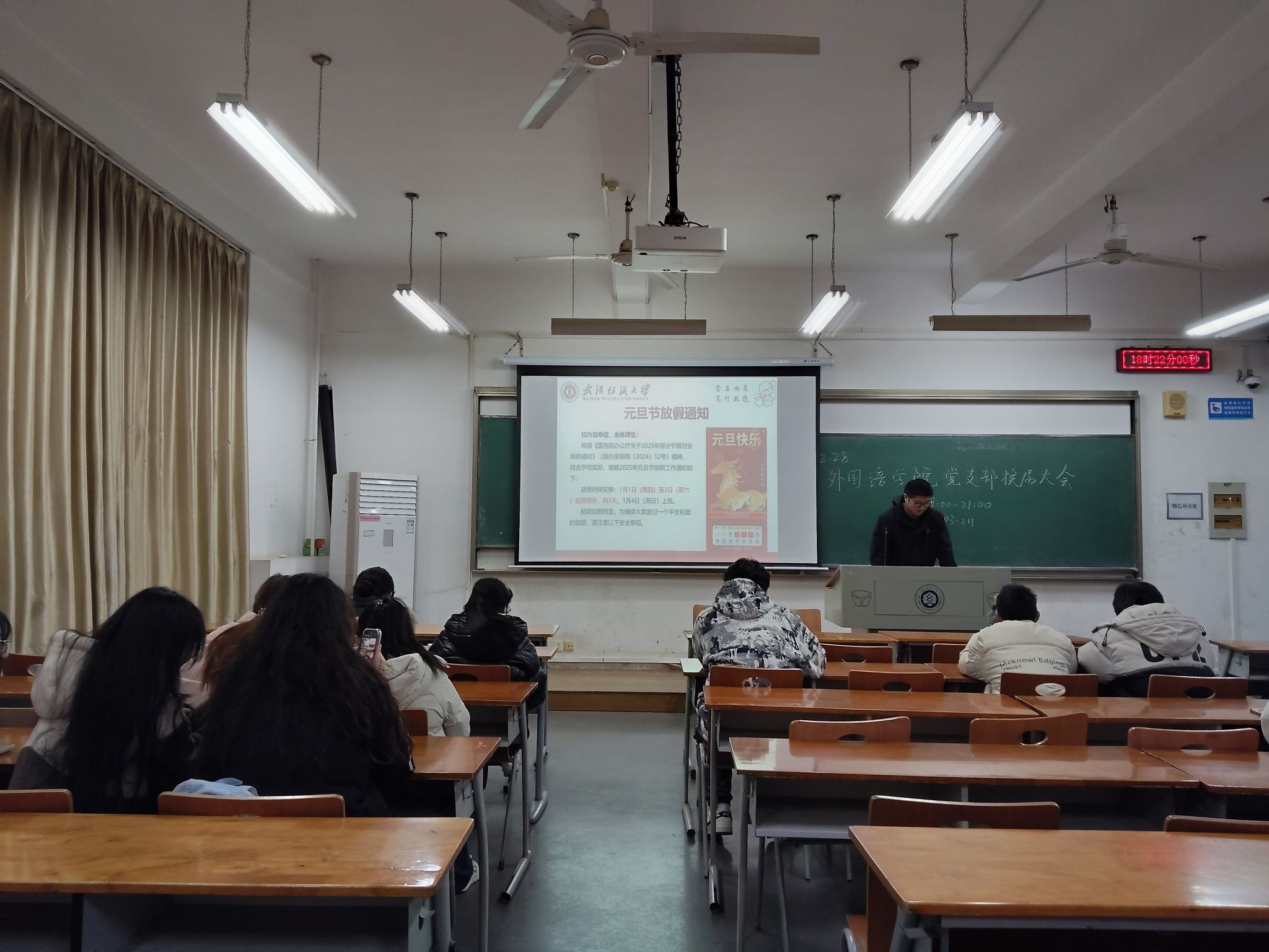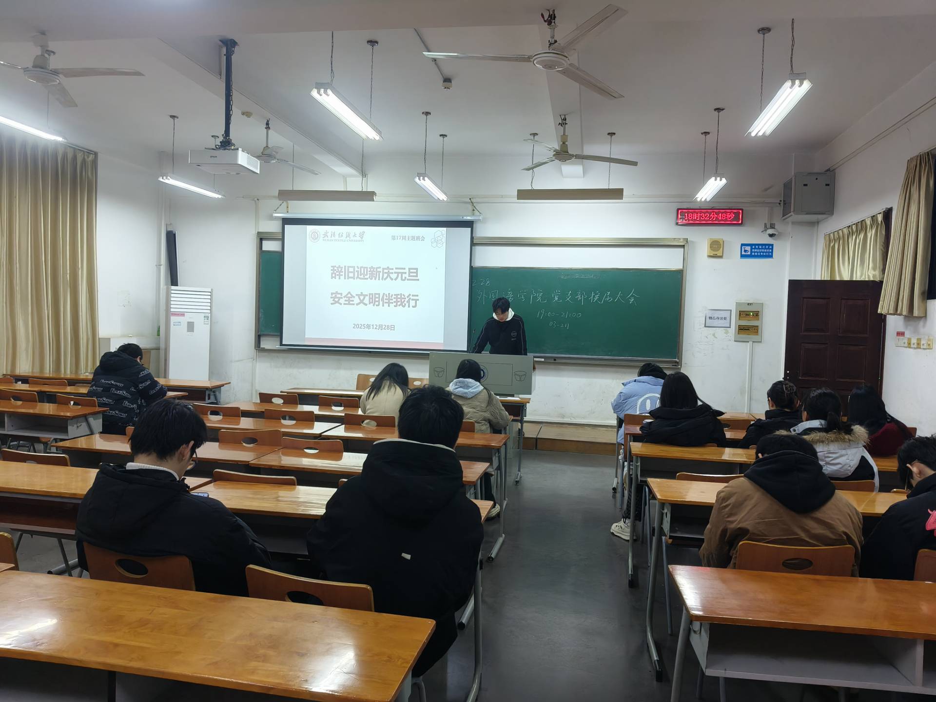 元旦的脚步悄然临近,安全文明的警钟时刻长鸣。12月28日,武汉纺织大学数学与统计学院在崇志楼开展了一场以“辞旧迎新庆元旦,安全文明伴我行”为主题的班会活动。各班班长结合元旦假期特点,为同学们讲解假期安全注意事项与文明行为准则,同学们认真聆听讲解、积极参与互动讨论,在新年将至的氛围中,筑牢安全文明意识防线,为度过平安祥和的元旦假期打下坚实基础。