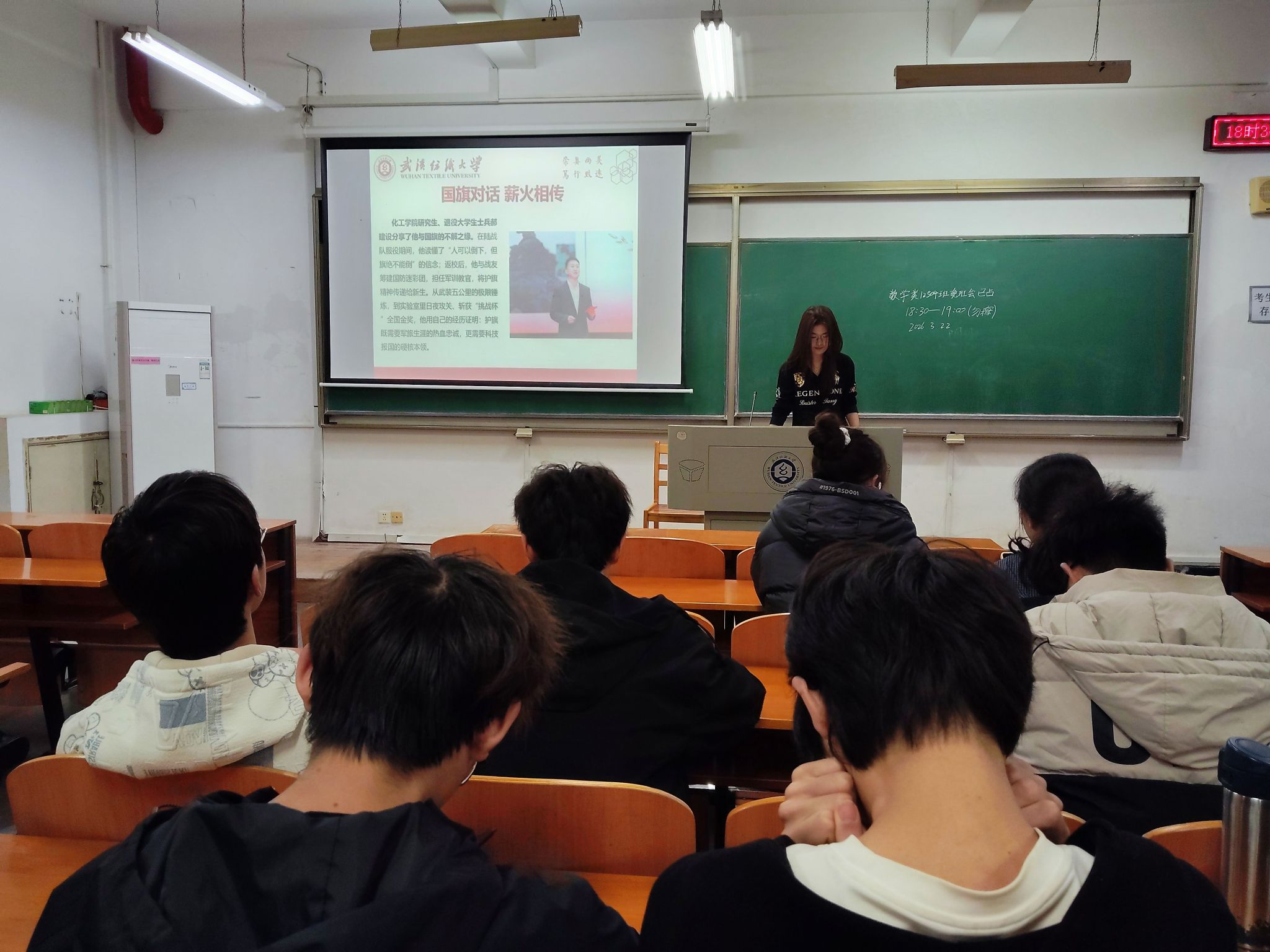 从“国旗与国旗的对话”主题思政课的校级盛会,到班级层面的分享交流,武汉纺织大学以层层递进的形式,将爱国主义教育融入青年成长的每一个环节。此次班级分享会作为校级思政活动的延伸,让爱国主义教育以更贴近青年的方式走进课堂。从数统学院班级里主讲同学解读退役大学生士兵吕远的爱国事迹,再到同学们端坐凝神、认真记录的课堂瞬间,这场以国旗为纽带的思想传递,让“中国红”从祖国心脏到浩瀚星河的精神力量,真正走进了每一位学子心中。同学们在沉浸式学习中读懂了国旗承载的民族记忆与时代使命,在榜样故事里汲取了奋进力量,将爱国情、强国志转化为踏实学习、勇担使命的实际行动,在传承红色基因的过程中,厚植起属于新时代青年的家国情怀。
