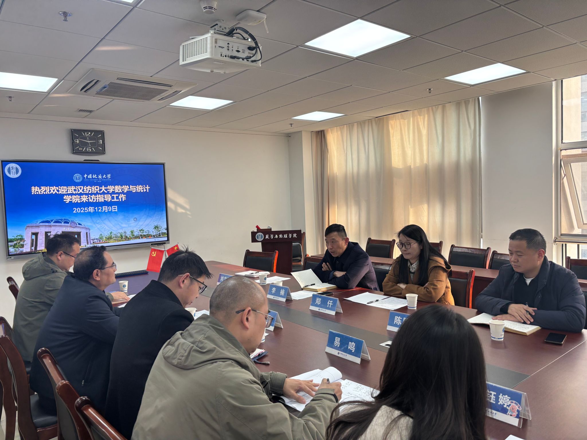 为进一步深化院际合作,借鉴优质办学经验,拓宽学科建设与人才培养思路,12月9日,数学与统计学院党委书记李楠、副院长郑仟、党委副书记陈国鹏、办公室主任刘文祥赴中国地大(武汉)数学与物理学院开展调研交流。中国地大(武汉)数学与物理学院相关领导参与座谈。