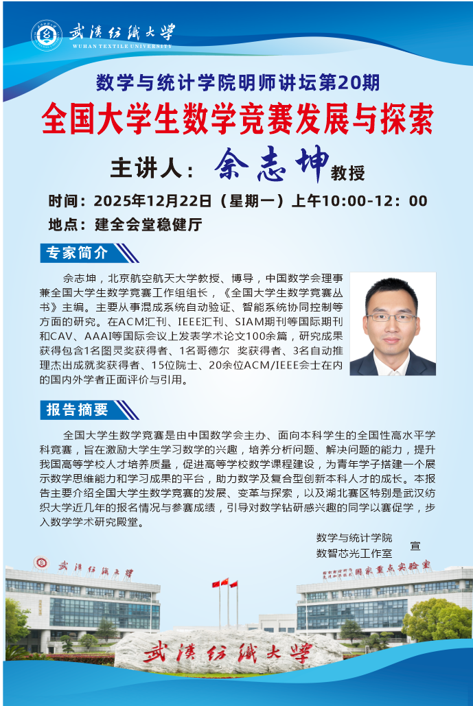 武汉纺织大学数学与统计学院于12月22日上午,在健全会堂稳健厅举办了“全国大学生数学竞赛与探索”专题学术报告。本次讲座特邀北京航空航天大学教授、博士生导师、全国大学生数学竞赛工作组组长佘志坤担任主讲。学院党委副书记陈国鹏及师生代表参加了本次活动,现场座无虚席,气氛热烈。